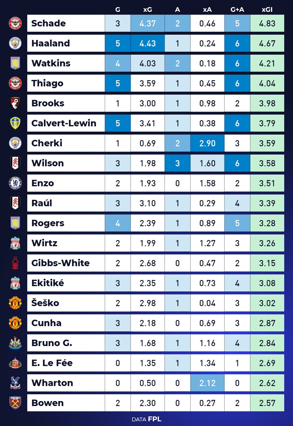 4) Kevin Schade is now the top player for expected goal involvements over the last six gameweeks.