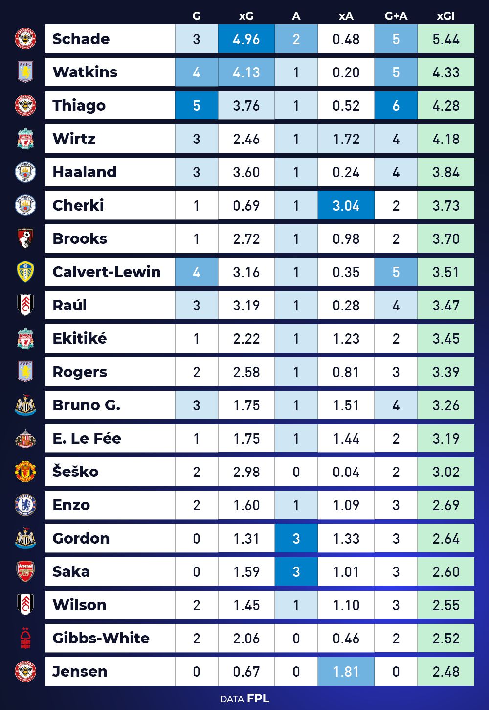 One return doesn’t do his stats justice, but he’s getting fewer high-quality chances than he’s used to. 2.7xGI over five gameweeks is low for Haaland, who has sat atop the underlying stats tables for so long that his arse cheeks are probably bruised.