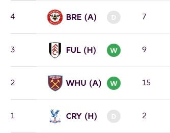 Arsenal: WHU, ful, CRY, bur, sun, TOT