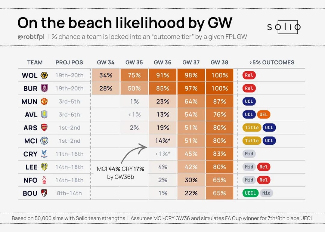 If you’re the sort of FPL manager who loves a marginal gain, X user robtfpl put together an excellent graphic which shows the odds of a team being on the beach.